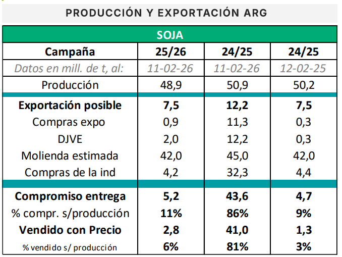 En Sudamérica, la cosecha brasileña avanza sobre el 24,7% del área, levemente por detrás del ritmo del año pasado, mientras que en Argentina las condiciones de los cultivos muestran una mejora significativa. Según la Bolsa de Cereales de Buenos Aires, el 33% de la superficie presenta un estado bueno a excelente, frente al 19% registrado a igual momento del ciclo previo. En el plano local, la soja disponible cerró en torno a los 336 dólares por tonelada en el Matba-Rofex, con un premio sobre el FAS teórico que evidencia una industria con capacidad de pago sostenida, en un contexto donde el volumen comercializado todavía es bajo en relación con la producción estimada.