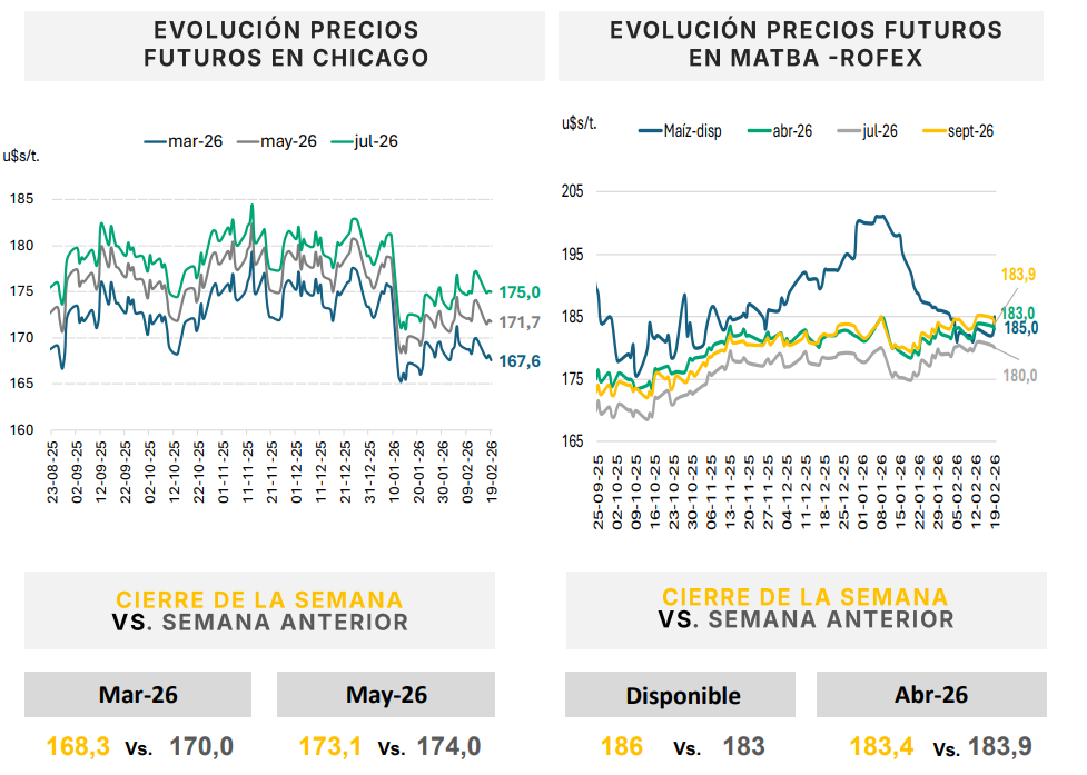 El maíz, por su parte, mostró un comportamiento más estable en el mercado de granos de Chicago. La posición marzo 2026 se mantuvo lateralizando en torno a los 168 dólares por tonelada, en un mercado que equilibra expectativas de menor área en Estados Unidos con señales mixtas desde Brasil. El USDA proyecta para 2026/27 una siembra de 38,04 millones de hectáreas, por debajo de las casi 40 millones del ciclo previo, con una producción estimada en 400 millones de toneladas, 32 millones menos que en 2025/26. Los stocks finales caerían de 54 a 47 millones de toneladas, lo que introduce un sesgo potencialmente alcista a mediano plazo.