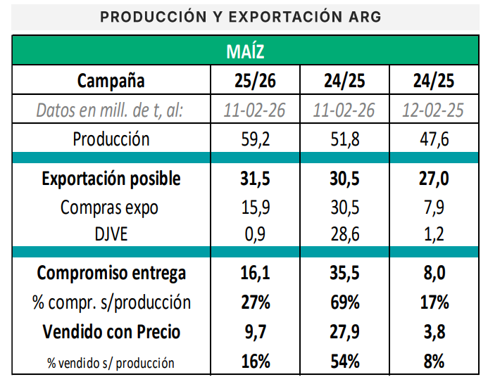 En Brasil, la siembra de maíz safrinha cubre el 46,1% del área, con cierto retraso respecto del promedio de los últimos cinco años. En Argentina, en cambio, las condiciones mejoraron: el 51% de los lotes se encuentra en estado bueno a excelente, tras una mejora intersemanal de nueve puntos porcentuales. En el mercado doméstico, el maíz disponible se ubicó cerca de los 185 dólares por tonelada, levemente por encima del FAS teórico, lo que indica una demanda activa por parte de la exportación. Sin embargo, el porcentaje de producción vendida con precio aún es bajo en comparación con campañas anteriores, reflejando cautela comercial.