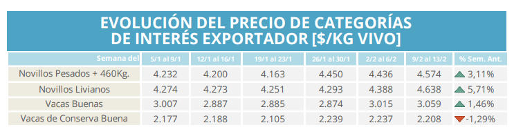 Cuando se amplía la mirada hacia las categorías de interés exportador, el panorama mantiene un tono mayormente positivo. Los novillos pesados superan los $4.570, mientras que los livianos se ubican por encima de $4.630, ambos con avances respecto de las semanas previas. Esta recomposición ayuda a sostener la expectativa de los feedlots y de los invernadores que miran el precio futuro de salida antes de reponer.