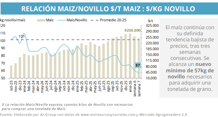 En paralelo, la relación maíz/novillo volvió a mejorar para el engordador. Con el cereal mostrando debilidad, se alcanzó un nuevo mínimo cercano a los 57 kilos de novillo necesarios para comprar una tonelada de grano. Es un dato clave porque fortalece los márgenes del corral y puede traducirse en mayor competencia por la reposición en las próximas semanas.