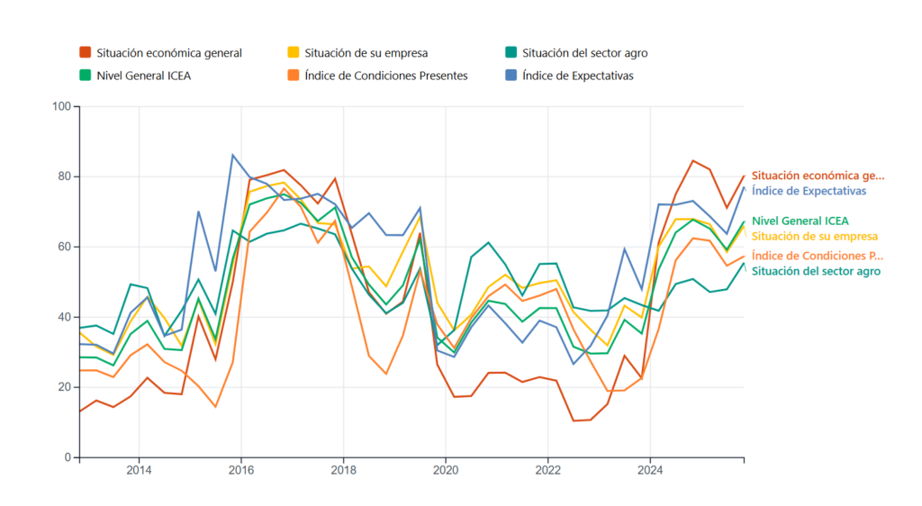 El ánimo del agro argentino atraviesa uno de sus mejores momentos de la última década. Así lo refleja el último Índice de Confianza del Sector Agropecuario elaborado por CREA, que mostró una recuperación significativa y alcanzó en noviembre los valores más altos desde 2016. La medición, surgida de la encuesta SEA CREA, recoge la opinión de más de 1.300 empresarios agropecuarios y 300 técnicos distribuidos en todo el país y confirma un cambio de clima en el interior productivo, marcado por expectativas más favorables respecto del rumbo económico y sectorial.
