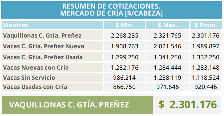 Las vaquillonas con garantía de preñez promediaron valores superiores a los 2,3 millones de pesos por cabeza, mientras que las vacas nuevas preñadas se ubicaron cerca de los 2 millones. Incluso las categorías usadas o con cría al pie mostraron firmeza, lo que confirma que el vientre sigue siendo un activo estratégico dentro del negocio ganadero.