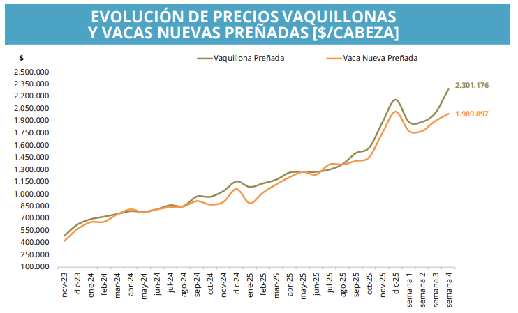 El mercado de cría continúa mostrando una fortaleza notable en este comienzo de año, con valores de vientres que se mantienen en niveles elevados y una demanda que, aunque más selectiva, sigue activa, según el informe de AZ Group y deCampoaCampo, el mercado ganadero online más grande del país. En la cuarta semana, las vaquillonas y vacas preñadas consolidaron precios que reflejan no solo el interés por recomponer rodeos, sino también una visión de mediano y largo plazo por parte de los productores.
