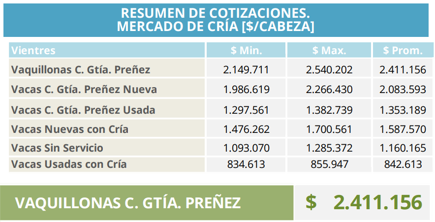 La vaquillona con garantía de preñez promedió $2.411.156 por cabeza, con una suba del 5% respecto de la semana previa. Las vacas nuevas preñadas alcanzaron $2.083.593, mientras que las vacas usadas preñadas se ubicaron en $1.353.189.
