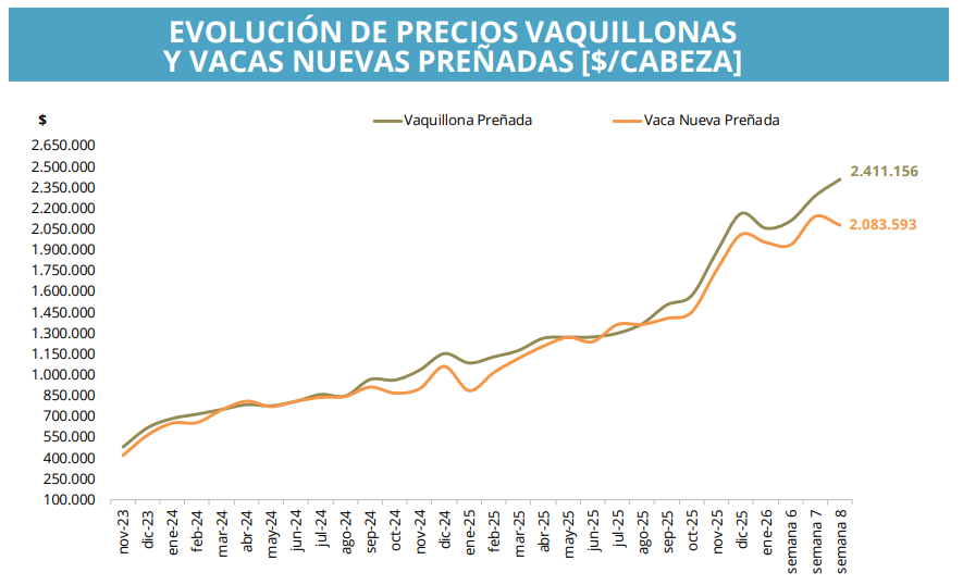 La evolución de los valores en los últimos meses muestra una tendencia sostenida al alza, particularmente en las categorías nuevas. Esto suele interpretarse como una señal de retención y de reconstrucción de stock, luego de años marcados por sequía y liquidación.