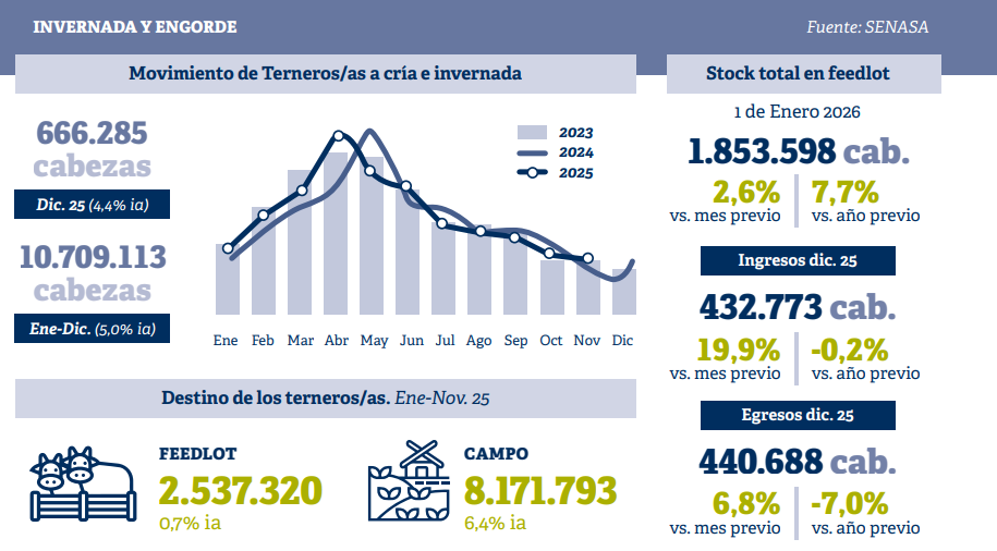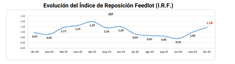 Según el informe de encierre al 1° de enero de 2026, la ocupación promedio de los feedlots relevados alcanzó el 64,2% sobre una capacidad total de más de 825.000 cabezas. El nivel representa una suba de 2,6 puntos porcentuales respecto del mes anterior y confirma una tendencia de mayor utilización de la capacidad instalada. En paralelo, el Índice de Reposición Feedlot (IRF) se ubicó en 1,18, indicando que por cada animal vendido ingresaron más de uno al sistema, una señal clara de reposición y apuesta al engorde.