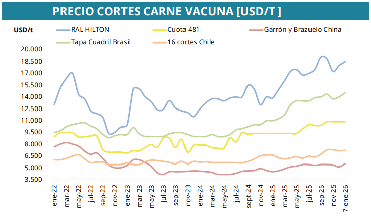 En materia de exportaciones para la ganadería, los cortes de alto valor continúan mostrando una tendencia positiva. La RAL Hilton alcanzó los USD 18.500 por tonelada, acumulando un incremento interanual superior al 30%, mientras que la Cuota 481 se ubicó en torno a los USD 14.500. Estos valores refuerzan la importancia de los mercados premium para sostener la rentabilidad de la cadena.