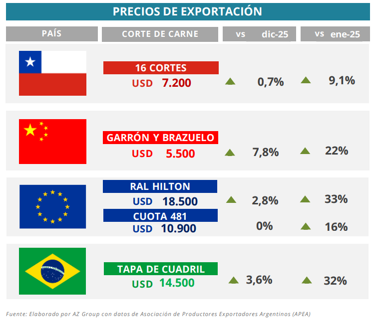 El informe también destaca el desempeño de Brasil, que cerró 2025 con un récord histórico de exportaciones, impulsado por una fuerte demanda china y la apertura de nuevos destinos. Este contexto genera competencia regional, pero también confirma que la demanda global de carne vacuna sigue firme, especialmente en Asia.
