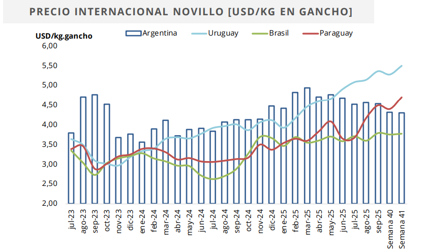 En Paraguay, el novillo cotizó a USD 3,90/kg, mostrando estabilidad luego de las caídas de septiembre. El país mantiene un flujo de exportaciones moderado, con Chile como principal destino, aunque sin grandes variaciones en precios.