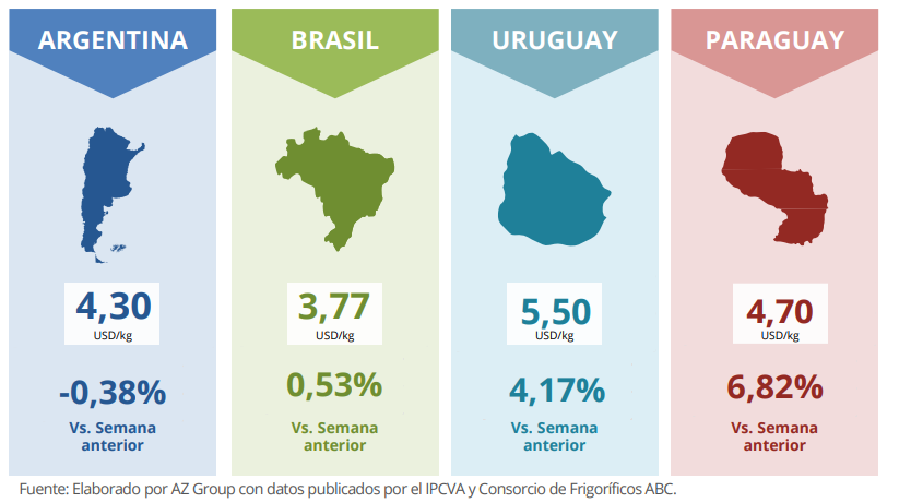 En contraposición, el novillo argentino cayó a USD 4,32 por kilo carcasa, una baja semanal del 2,66% y una variación negativa del 8,5% en el último mes.