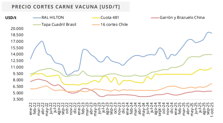 Justamente Chile, que actúa como comprador más que como exportador, redujo sus importaciones de carne vacuna en un 12% interanual, reflejando un consumo interno más ajustado.