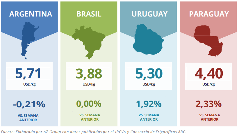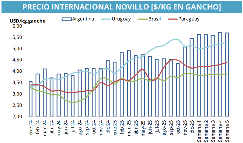 El precio internacional del novillo argentino se ubicó en US$5,71 por kilo gancho, mostrando una suba semanal del 1,9%. Esta mejora refuerza la competitividad de la exportación para la ganadería y explica, en parte, la reactivación de categorías como la vaca conserva y el novillo pesado, que registraron subas del 6,3% y 7% respectivamente en el mercado interno.