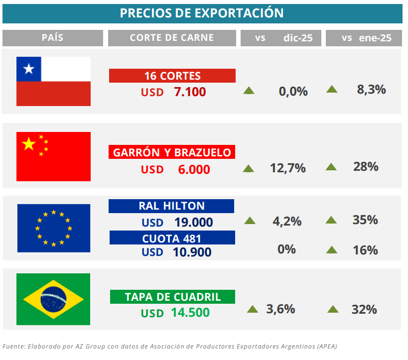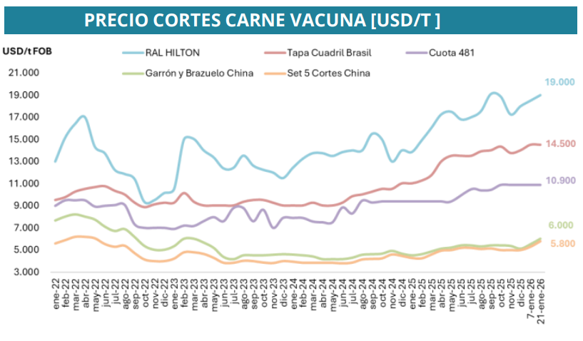Los exportadores argentinos aprovecharon el evento para renegociar contratos bajo las nuevas reglas de juego para la ganadería, priorizando cortes de mayor valor unitario. En este contexto, el valor promedio de los cortes RAL Hilton alcanzó los US$19.000 por tonelada en la segunda quincena de enero, mientras que el promedio mensual se ubicó en US$18.750, un 35% por encima de enero de 2024.