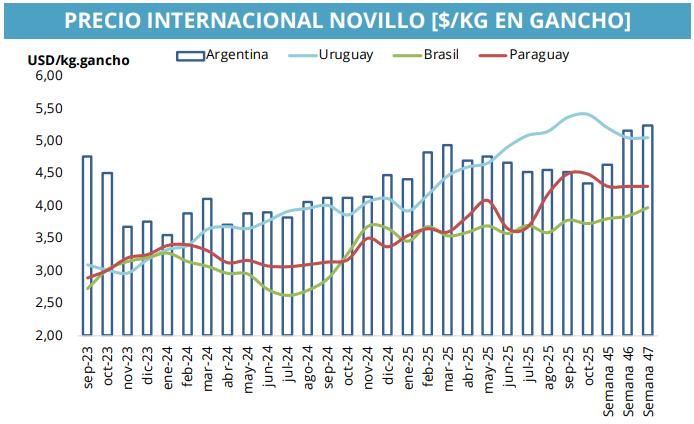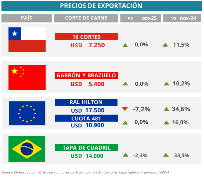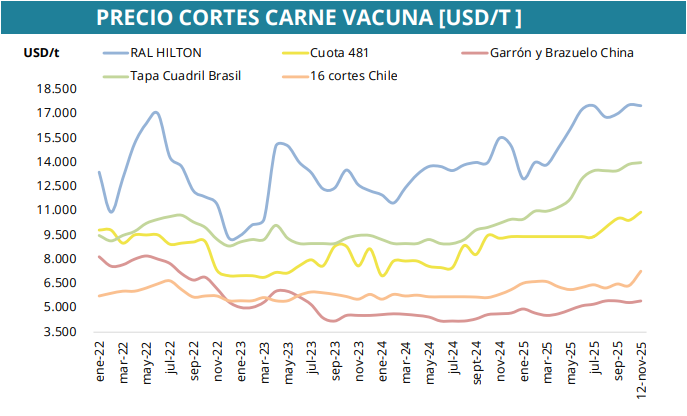 Sin embargo, no todas las señales fueron positivas. El valor del garrón y brazuelo a China —el principal destino por volumen— retrocedió 7,2%, ubicándose en USD 4.000-5.400/t según el tipo de corte y calidad. China continúa mostrando debilidad en su demanda, afectada por altos niveles de stocks frigoríficos y una economía interna que aún no consolida su recuperación. Esta baja presiona la rentabilidad exportadora en el segmento que representa mayor volumen de envíos.