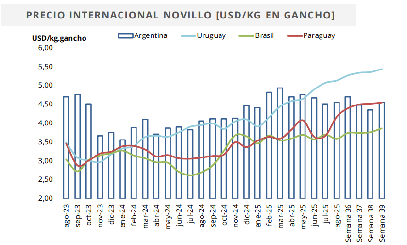 En el país vecino, el novillo exportación se ubicó en USD 5,45 por kilo, confirmando a Uruguay como el líder regional en valores. Esta diferencia responde a varios factores: un stock de hacienda de alta calidad, certificaciones sanitarias que le permiten acceder a los mercados más exigentes y una demanda externa que sigue privilegiando la carne uruguaya.