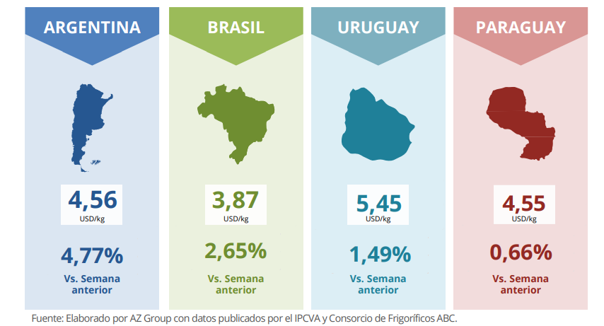 Con un novillo argentino que recupera valor en dólares, un Uruguay que sigue liderando en precios y un Brasil que apuesta a la competitividad por volumen, el mapa regional de la carne mantiene su diversidad de estrategias.