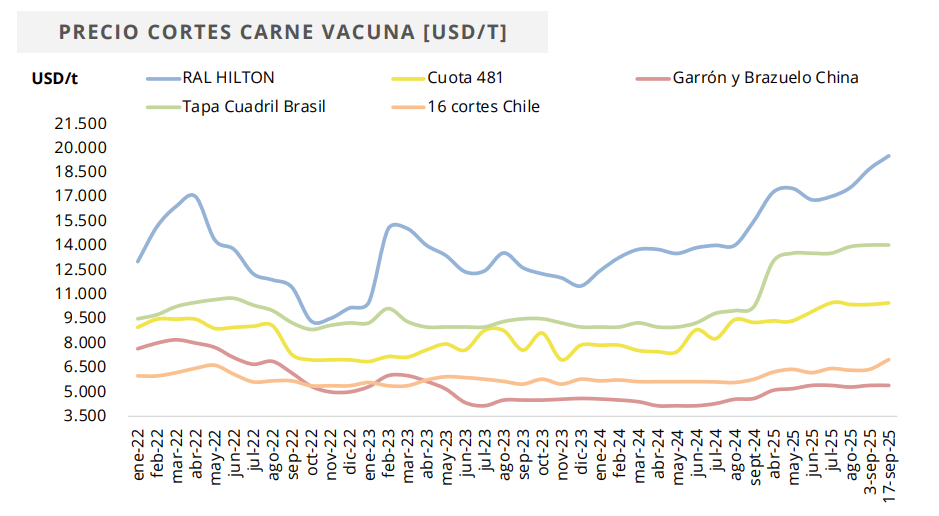 En el plano local, el Gobierno argentino confirmó la continuidad del esquema de retenciones cero para las exportaciones de carne vacuna y aviar hasta el 31 de octubre. La medida busca sostener la competitividad externa en un contexto de costos internos elevados y precios internacionales en retroceso para algunos cortes.
