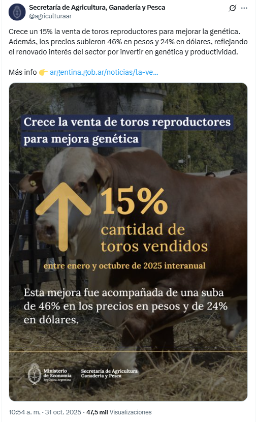 De acuerdo con la Secretaría de Agricultura, Ganadería y Pesca del Ministerio de Economía, los remates ganaderos destinados a mejora genética registraron un incremento sostenido tanto en volumen como en precios, lo que refleja la confianza de los productores en el futuro de la actividad. En ese mismo período, los valores promedio de los toros reproductores aumentaron un 46% en pesos y un 24% en dólares, marcando una recuperación real en términos de rentabilidad.