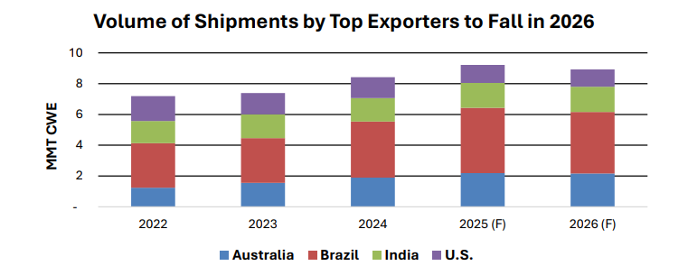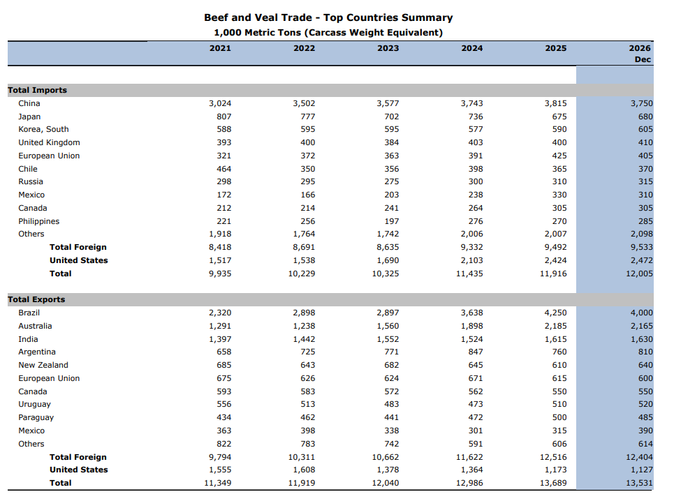 En Estados Unidos, la menor producción interna y la reducción de la faena de vacas y toros —que limita la oferta de carne magra para procesamiento— impulsarán un aumento de las importaciones, que crecerían un 2 % hasta 2,5 millones de toneladas. En contraste, las exportaciones estadounidenses caerían un 4 %, afectadas por la escasez de oferta, la competencia de Australia y la falta de acceso al mercado chino.