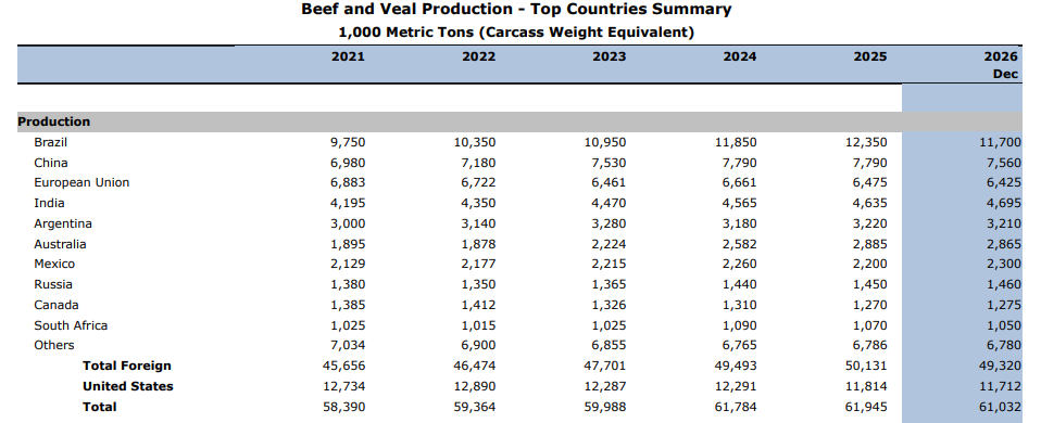 Fuente: Departamento de Agricultura de Estados Unidos (USDA), Livestock and Poultry: World Markets and Trade, enero de 2026.