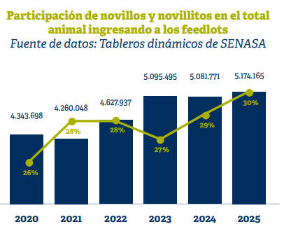 La menor proporción de terneros enviados directamente a corrales no implicó, sin embargo, una caída del engorde a corral. Por el contrario, el análisis señala que esta recuperación de la recría se da en un contexto de alto nivel de encierre, con más de 5 millones de animales ingresando anualmente a feedlots. En ese esquema, se observa un cambio relevante en la composición de los ingresos: crece la participación de novillos y novillitos recriados previamente a campo, que hoy explican cerca del 30% de los animales que entran a los sistemas intensivos.