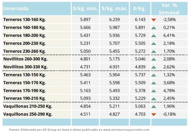 Los valores de los terneros y terneras de invernada evidenciaron movimientos dispares. Mientras los terneros livianos de 130 a 160 kilos registraron una baja semanal cercana al 2,6%, otras categorías mostraron subas moderadas, especialmente los terneros de 180 a 200 kilos, que avanzaron más del 6%. Este comportamiento refleja un mercado selectivo, donde la calidad, el peso y el destino productivo comienzan a pesar más que la lógica general de oferta y demanda.