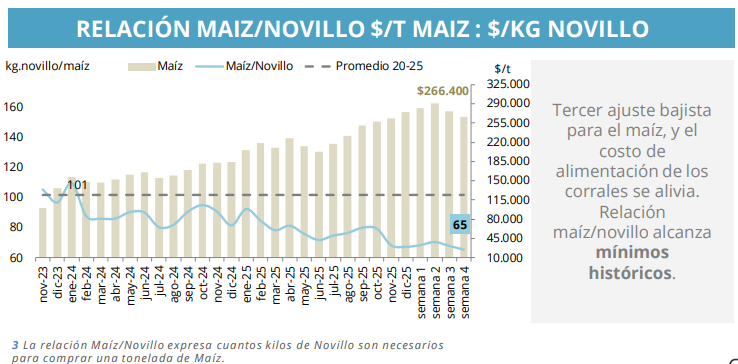 Un factor que empieza a jugar a favor del engorde es el alivio en el costo del maíz. El cereal encadenó su tercer ajuste bajista consecutivo y llevó la relación maíz/novillo a mínimos históricos. Esto mejora sensiblemente el costo de alimentación de los corrales y genera un incentivo adicional para sostener la demanda de invernada, aun en un contexto de reposición firme.