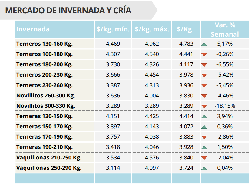 Las vaquillonas de 210 a 250 kg promediaron $3.840/kg (-2,04%), y las de 250 a 290 kg se mantuvieron casi sin cambios, en $3.724/kg.