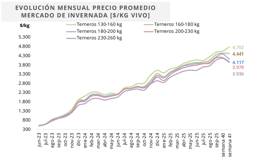 En cambio, los 160-180 kg mostraron una leve baja del 0,26%, con un promedio de $4.441/kg, mientras que los 180-200 kg sufrieron una caída más pronunciada, del 6,55%, ubicándose en $4.117/kg.