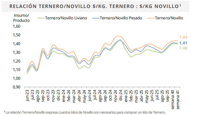 El indicador que mide cuántos kilos de novillo terminado son necesarios para comprar un kilo de ternero —la relación ternero/novillo— volvió a subir levemente y se ubicó en 1,44, lo que refleja la persistencia de una brecha amplia que limita la reposición en feedlots.