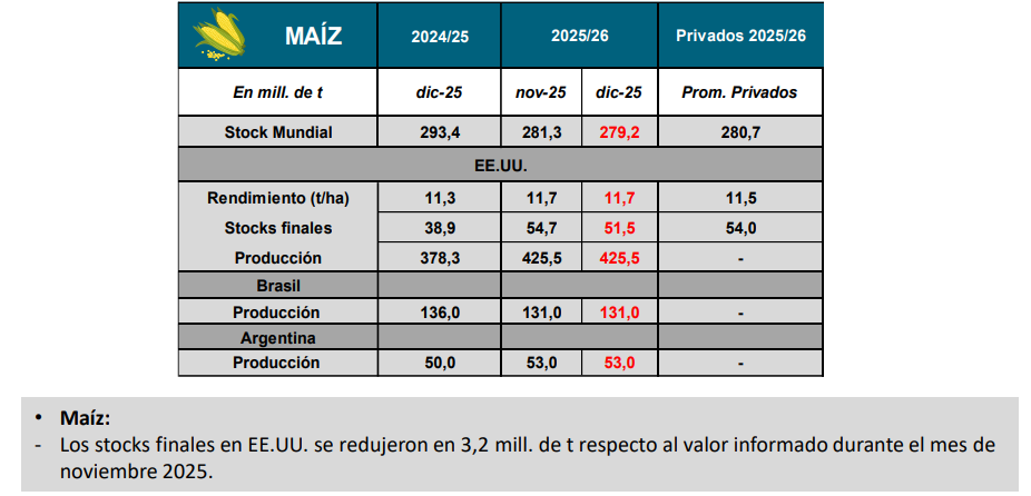 A diferencia de la soja, el mercado del maíz mostró en diciembre algunas señales más firmes, impulsadas por ajustes en la oferta global que comenzaron a reflejarse en los balances internacionales. El USDA recortó la producción mundial del ciclo 2025/26 en 3,3 millones de toneladas, ubicándola en 1.282,9 millones, un dato que fue bien recibido por los operadores.