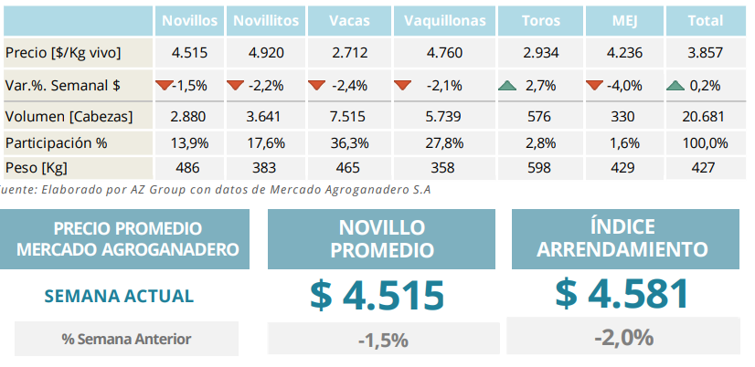 Los novillos pesados de más de 460 kilos se ubicaron en $4.585 por kilo, con una caída semanal del 2,06%, mientras que los novillos livianos promediaron $4.670, con una baja del 1,67%.