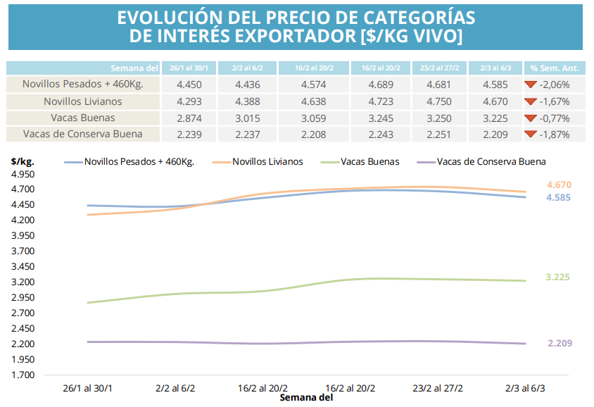 Las vaquillonas también mostraron una caída del 2,1%, con un precio promedio de $4.760 por kilo vivo.