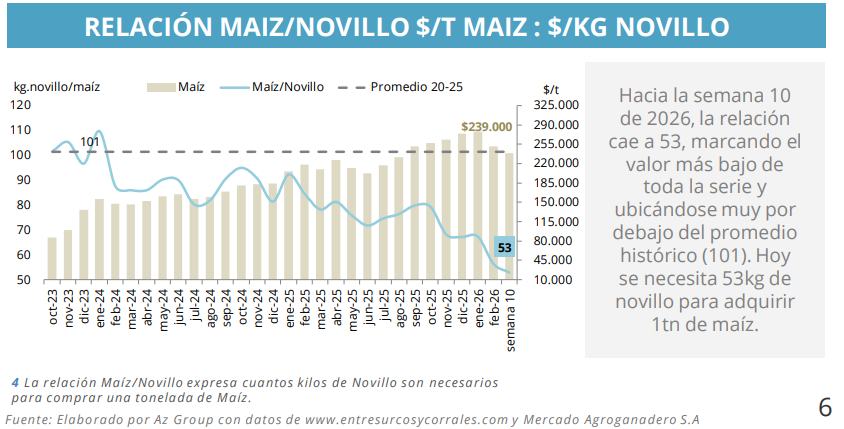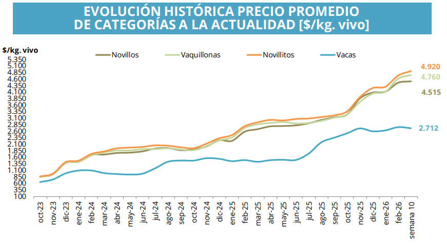 Sin embargo, al analizar cada categoría en particular se observan algunas diferencias. El novillo registró un valor promedio de $4.515 por kilo, con una caída semanal del 1,5%. Se trata de una de las categorías más representativas para el mercado, especialmente por su vínculo con la exportación.