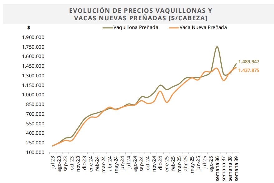 Las vaquillonas con garantía de preñez volvieron a ser las más demandadas. En la semana 39 promediaron $1.489.947 por cabeza, con un rango de operaciones que osciló entre $1.380.000 y $1.580.000, dependiendo de la calidad genética y la sanidad de los lotes.