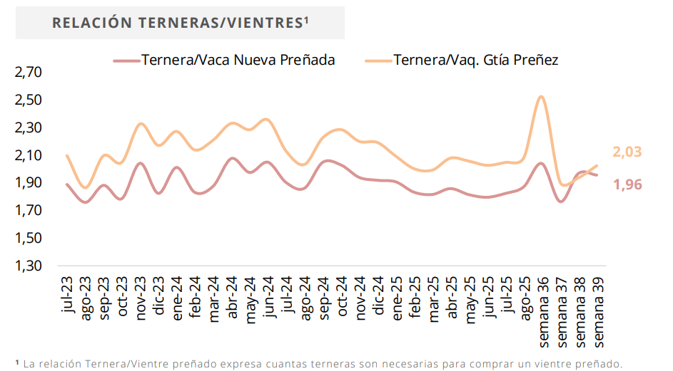 Un indicador clave que sigue marcando tendencia es la relación ternera/vientre preñado. En la semana 39, se ubicó en 42,2, lo que significa que se necesitan poco más de 42 terneras de invernada para comprar una vaquillona preñada.