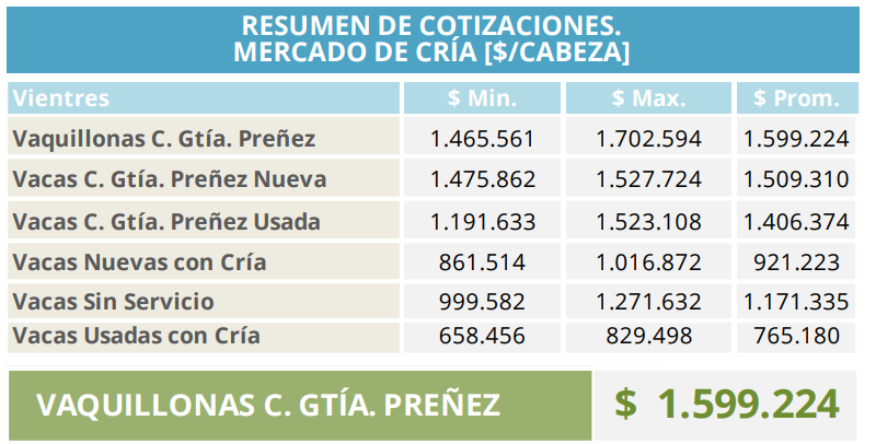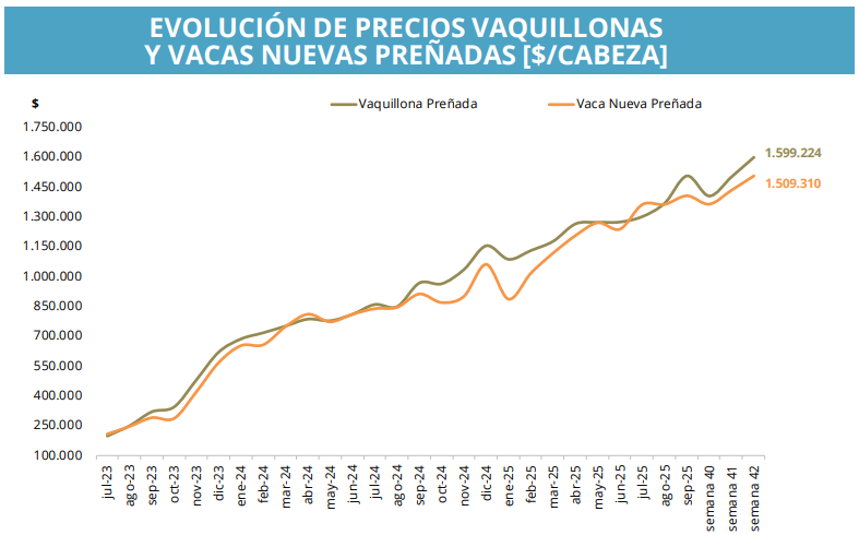 Las vaquillonas con garantía de preñez siguen siendo la categoría más buscada del mercado. En la semana 42, el promedio nacional alcanzó los $1.638.076 por cabeza, con valores que oscilaron entre $1.550.000 y $1.700.000 dependiendo de la calidad, la procedencia y el estado corporal de los animales.