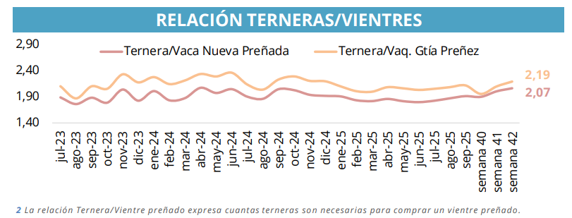 El indicador que mide cuántas terneras de invernada se necesitan para adquirir una vaquillona preñada se ubicó en 44,1, mostrando una ligera mejora frente a la semana anterior. Este descenso refleja la suba generalizada de precios en la invernada, pero también la estabilidad en los vientres, que lograron conservar su valor sin grandes sobresaltos.