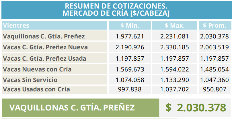 Las vacas nuevas con garantía de preñez promediaron $2.063.519 por cabeza, mientras que las vacas usadas preñadas y las vacas con cría continuaron mostrando valores más contenidos. La dispersión de precios entre categorías evidencia un mercado selectivo, donde la calidad, la edad y la seguridad reproductiva pesan más que nunca en la decisión de compra.
