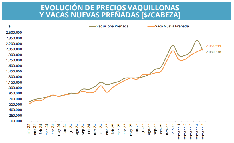 El mercado de cría mostró en la última semana de enero un ajuste significativo en los valores de los vientres, especialmente en las vaquillonas con garantía de preñez, que registraron una baja del 12% respecto de la semana anterior. El precio promedio se ubicó en $2.030.378 por cabeza, marcando un punto de inflexión tras varios meses de firmeza sostenida. Este movimiento refleja un cambio en el ánimo del productor, más enfocado en preservar liquidez y ordenar números que en expandir stock, según el informe de AZ Group y deCampoaCampo, el mercado ganadero online más grande del país.