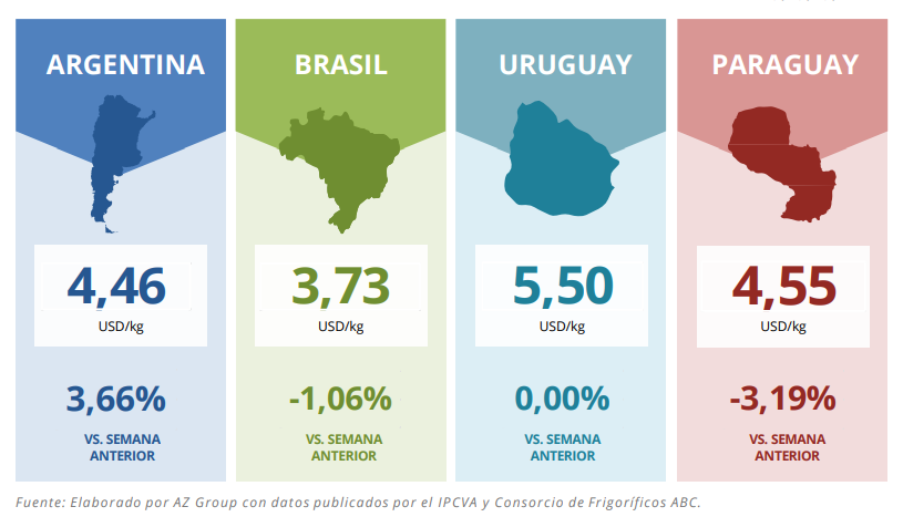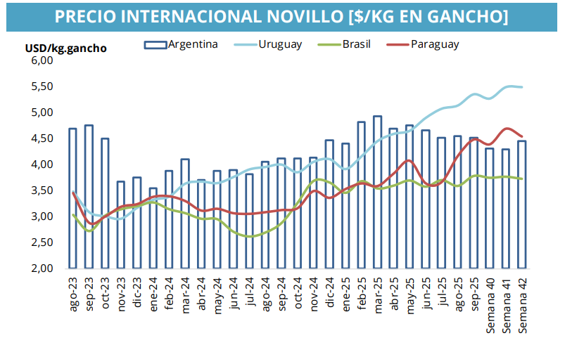 El novillo brasileño cotizó a USD 3,73/kg carcasa, con una leve baja del 0,27% respecto a la semana anterior. Sin embargo, el dato relevante es que el país continúa exportando volúmenes récord, consolidando su liderazgo mundial.