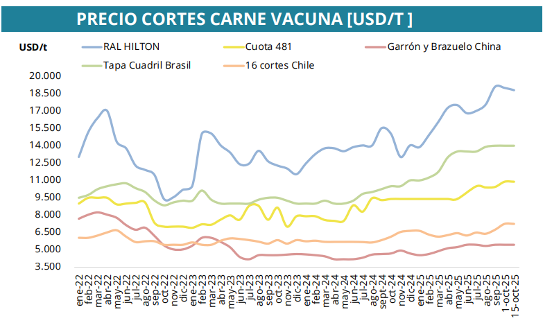 En Asia, el panorama también es favorable. China continúa siendo el principal comprador de carne argentina, uruguaya y brasileña, y si bien los precios permanecen contenidos, el volumen de compras se mantiene estable, lo que garantiza un flujo sostenido de exportaciones.