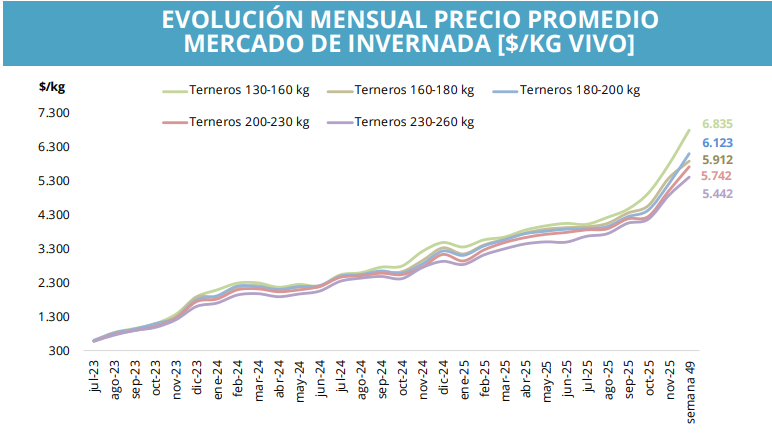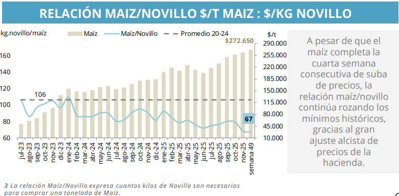 Aun así, la relación maíz/novillo mantiene valores cercanos a mínimos históricos, gracias al fuerte ajuste alcista en los precios de la hacienda. Esto permite cierta competitividad en los corrales, aunque la reposición sigue siendo el principal dolor de cabeza del engordador. Cada semana se renueva la sensación de que los precios de la invernada alcanzaron su techo, pero el mercado vuelve a demostrar lo contrario.