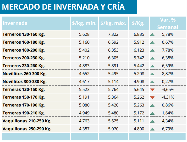 En contraposición, la invernada hembra mostró una dinámica más moderada. Las terneras de 130 a 150 kilos promediaron $5.645, cayendo 3,65%, mientras que las de 150 a 170 kilos retrocedieron 4,31%. Recién a partir de los 170 kilos se observó cierta recomposición.