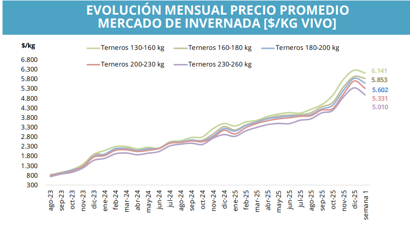 Los precios promedio del ternero de invernada de 170 kilos se ubicaron en torno a los $5.853/kg vivo, reflejando continuidad y estabilidad en relación con el cierre de diciembre. Lejos de observarse un retroceso estacional, la invernada mantiene valores elevados en términos reales, impulsada por una demanda que sigue activa y una oferta que no termina de recomponerse plenamente tras los años de ajuste del stock. En particular, las categorías livianas continúan siendo las más buscadas, con subas semanales significativas en algunos rangos de peso, lo que confirma que el interés por reponer sigue vigente aun en un contexto de márgenes ajustados.