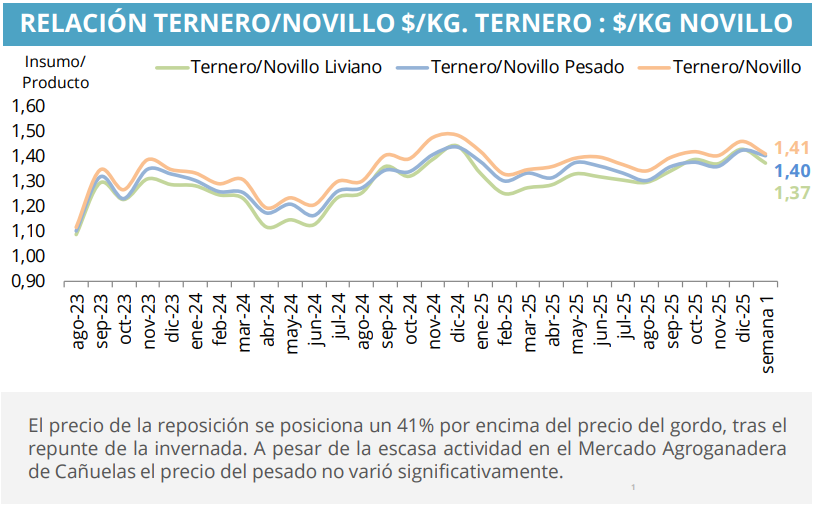 Uno de los elementos centrales que explica esta firmeza en la invernada es la relación entre el precio de la reposición y el gordo, que se posiciona cerca de un 41% por encima del valor del novillo. Esta brecha no es menor y obliga a recalcular números, pero no ha sido suficiente para frenar la demanda. La expectativa de estabilidad del gordo, sumada a una mejora gradual en las condiciones forrajeras, sostiene la decisión de compra, especialmente para planteos de recría a campo que buscan capitalizar kilos baratos en términos relativos.