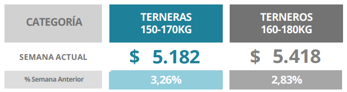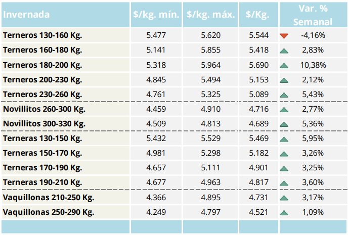 También los terneros de 160 a 180 kg tuvieron una semana positiva, con un incremento del 4,69%, alcanzando un promedio de $5.269/kg. En paralelo, los terneros de 180-200 kg avanzaron 6,97%, ubicándose en $5.155/kg, mientras que el segmento de 200-230 kg subió 8,61%, con un promedio de $5.045/kg. El rango de 230-260 kg, por su parte, registró una suba más moderada del 3,71%, situándose en $4.827/kg.