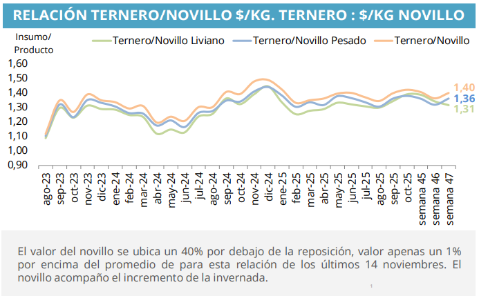 El dato técnico que complementa la lectura del mercado es la relación ternero/novillo, que esta semana ubicó a la reposición un 31% por encima del valor del novillo pesado, un diferencial que se explica tanto por la presión de la demanda como por la menor oferta de animales livianos que suele caracterizar esta época del año.