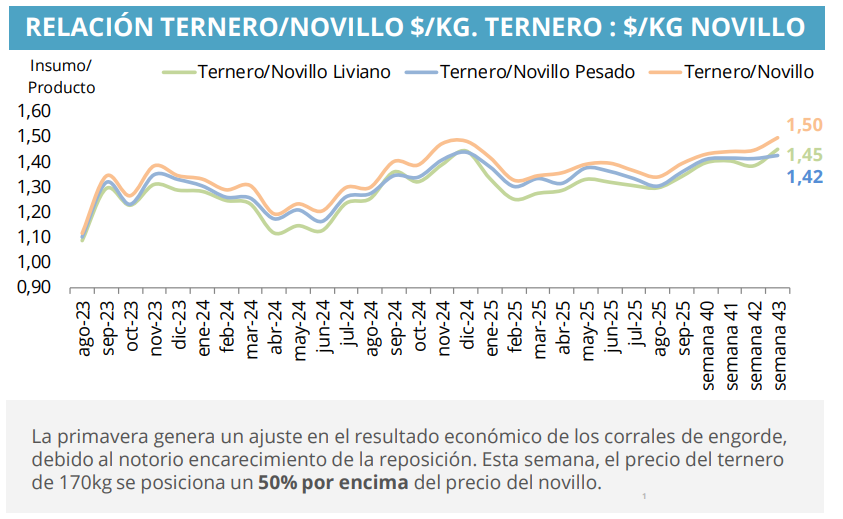 En lo que respecta al mercado del gordo, la estabilidad en los precios finales todavía no se traduce en una mejora contundente de los márgenes del feedlot, aunque sí se observa una menor volatilidad. Aun así, los engordadores sostienen sus compras apostando a una mejora hacia el verano, cuando la demanda de carne suele repuntar.
